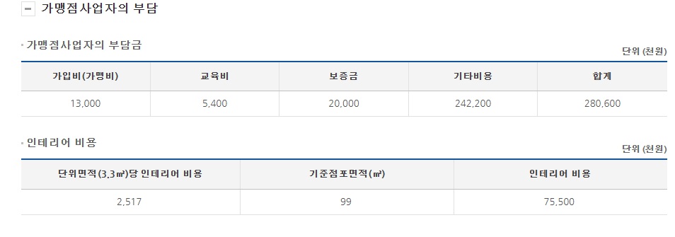 프랜차이즈 정보 공개서의 내용에 따르면 30평 규모의 매장을 신규 창업을 하기 위해서는 최소 3억5천만원 정도의 창업 비용이 발생하며